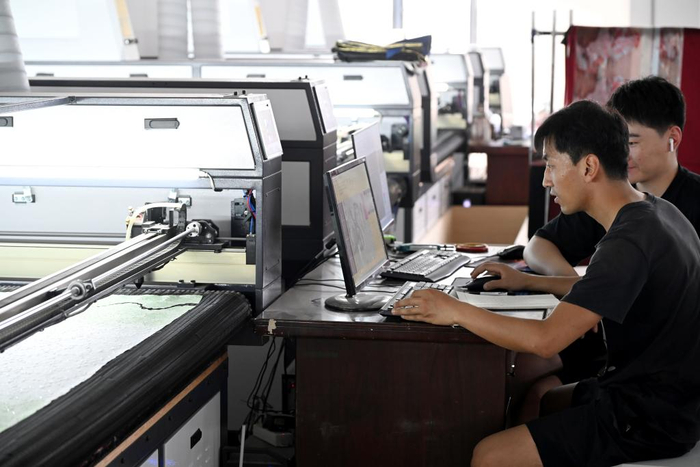 6月18日,在曹县有爱云仓汉服基地,设计人员在设计马面裙花样。