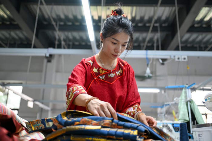 6月18日,姚驰行在生产车间查看马面裙半成品。