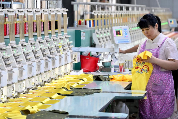 6月19日,在曹县一家公司,工作人员在加工绣布。
