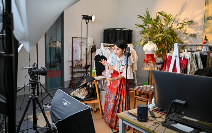 6月18日,姚驰行在直播推介汉服。