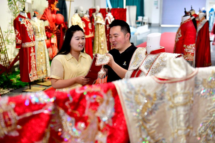 6月18日,曹县山河锦绣汉服设计馆负责人陈龙(后)与同事讨论汉服设计事宜。