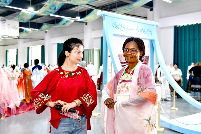 6月19日,在曹县有爱云仓汉服基地,中华女子学院非洲法语国家妇女能力建设研修班的学员在体验汉服。
