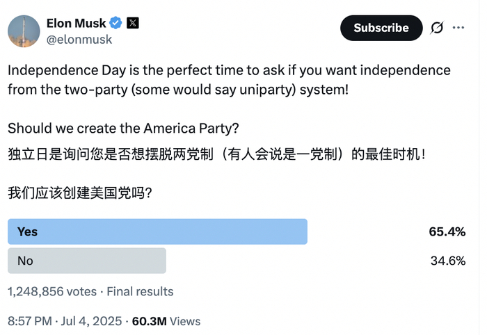 在法案签署前数小时,马斯克发起网络投票征询是否应成立“美国党”,约124.9万网民参与投票,65.4%表示支持。基于这一结果,马斯克于7月5日正式宣布新党成立。