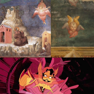 左上:乔托的湿壁画,描绘圣方济各看到炽天使色辣芬降临的场景;右上:意大利文艺复兴画家彼得罗·佩鲁吉诺画的炽天使;下:《爱死机4》中的堕天使