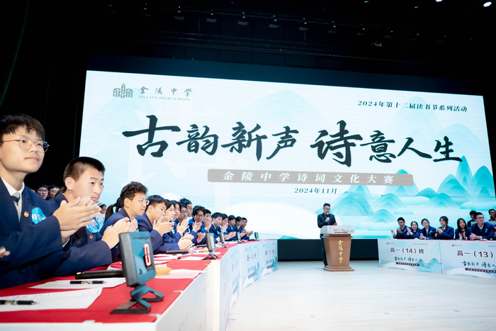 一场诗词大赛,同样可以窥见别样的校园文化。去年11月23日,学校读书节系列活动之一的诗词文化大赛拉开帷幕。以“飞花令”的方式说出带有数字的诗句,巧妙的环节设计瞬时将现场氛围拉满,“会当凌绝顶,一览众山小”“晚来天欲雪,能饮一杯无”“一曲新词酒一杯,去年天气旧亭台”“待到秋来九月八,我花开后百花杀”“窗含西岭千秋雪,门泊东吴万里船”……精彩的比拼令受邀来当评委的南京大学文学院副教授冯乾连连称赞。