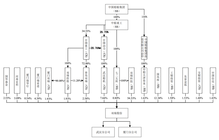 中国船舶集团通过双瑞科技、武汉船机、青岛双瑞、厦门双瑞、双瑞控股、 中船天津资本、七二五所合计间接持有公司 71.07%股份,为公司的实际控制人。 国务院国资委于 2019 年 10 月下发《关于中国船舶工业集团有限公司和中国船舶重工集团有限公司重组的通知》(国资发改革〔2019〕100 号),经国务院批准,同意中船工业与中船重工实施联合重组,新设中国船舶集团,由国务院国资委代表国务院履行出资人职责,中船工业和中船重工 100%的股权无偿划转至中国船舶集团。目前中船重工 100%股权划转至中国船舶集团的工商变更登记已办理完毕。