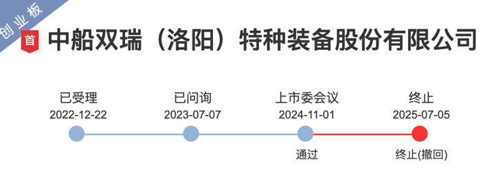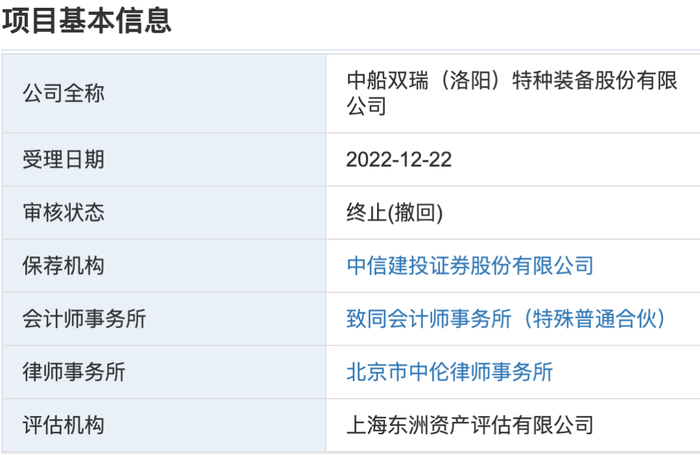 2025年7月5日,深交所官网显示,中船双瑞(洛阳)特种装备股份有限公司(简称:双瑞股份)创业板IPO终止,保荐机构为中信建投证券股份有限公司,审计机构为致同会计师事务所(特殊普通合伙),律师事务所为北京市中伦律师事务所。