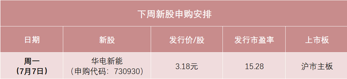 根据目前的发行安排,下周只有1只新股申购,即周一(7月7日)的沪市主板新股华电新能。
