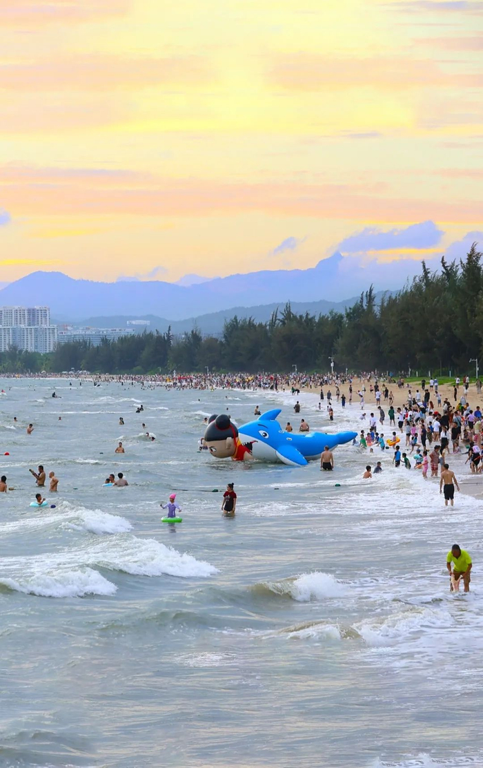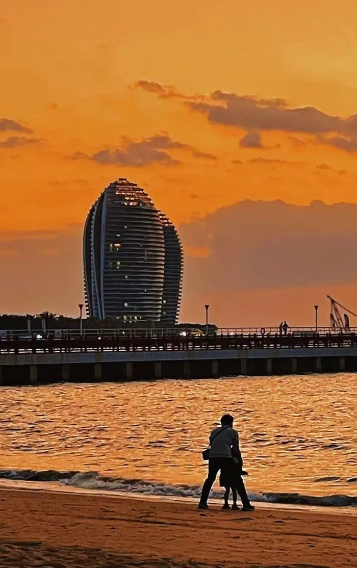 短暂易逝又恢弘美丽的日落时分,是三亚湾一天中天光最美的时候。当夕阳缓缓沉入海平面,天空与大海被染成橘红色,仿佛坠入一片橘子海。沙滩、栈桥、椰林、草坪......每一处都美得恰到好处、相得益彰。