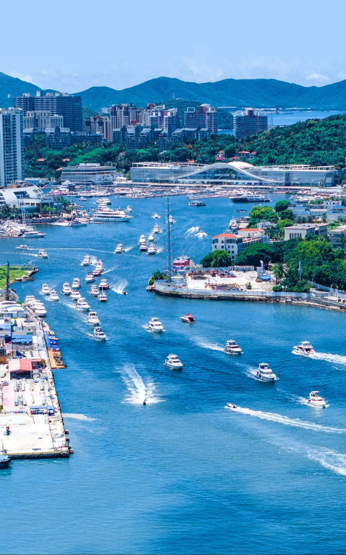 引擎轰鸣,浪花飞溅,一艘艘游艇在湛蓝的海面上拖曳出长长的水波,整个海湾壮观无比,三亚真的“艇”热闹。