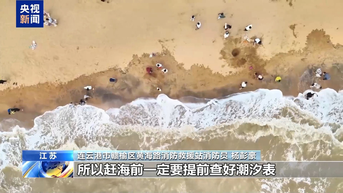 连云港市赣榆区黄海路消防救援站消防员 杨彭豪:有的海域遍布周围的各种礁石裸露在外,给游客提供了便利。但涨潮速度非常快,半小时就可能被海水淹没。所以赶海前一定要提前查好潮汐表,选择风平浪静的天气出行,选择正规景区内的赶海区域。遇到台风预警或暴雨天气,坚决不能下海。