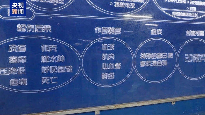 天津极地海洋公园生物保育部副部长 陈志伟:这个是我国海边比较常见的一种水母叫海月水母,因为它长得比较像月亮而得名。它的毒性主要是通过刺细胞接触在我们皮肤上,通过刺囊的毒素注射到我们皮肤上,造成我们皮肤红肿发炎,甚至头晕目眩休克都有可能。