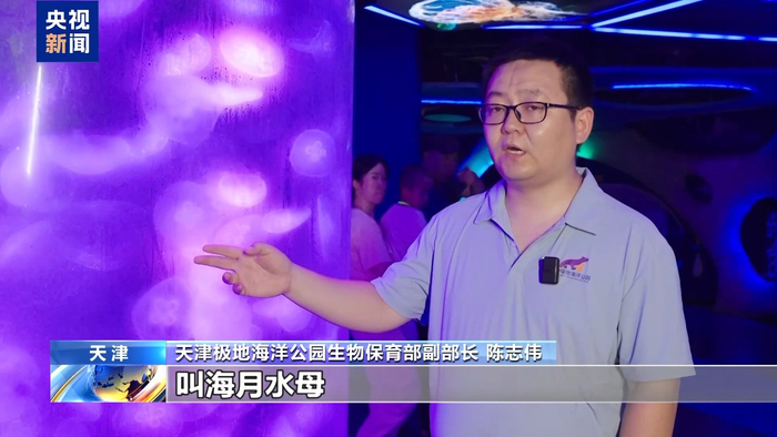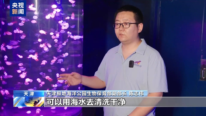 天津极地海洋公园生物保育部副部长 陈志伟:如果不小心被水母蜇伤,可以用海水清洗干净,如果有残存触手的话,可以用镊子夹掉,然后用一些食醋涂抹伤口,如果再严重的话要及时就医。