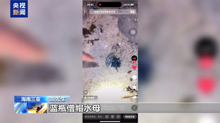 刘先生:就是这个东西,蓝瓶僧帽水母,它底下这个触须都是带毒的。