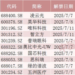 具体来看,Wind数据显示,凌云光7月7日将解禁2.24亿股,均为首发原股东限售股份。昊华科技7月8日将解禁1.61亿股,均为定向增发机构配售股份。唯科科技7月11日将解禁5690万股,均为首发原股东限售股份。