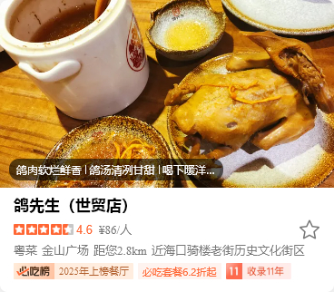 推荐菜:玉竹无花果炖全鸽、全鸽养生汤、市井钵仔腊味饭