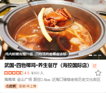 推荐菜:四物椰鸡、四物鸡汤、生上文昌鸡