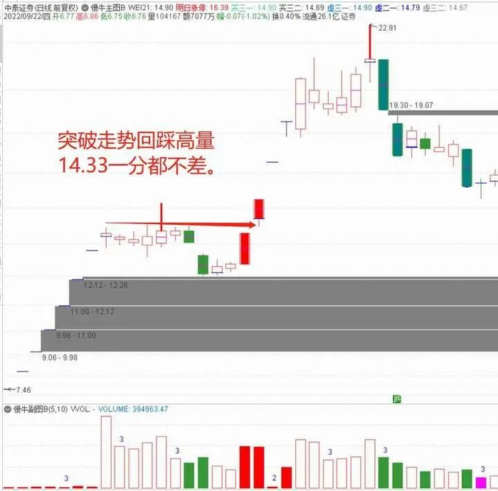 案例1:中泰证券在2020年7月3日,涨停板过左锋的时候,一根小腿精准触及左侧高量柱顶部价格14.33,一分都不差,主力的节奏在细节出展现的淋漓尽致。