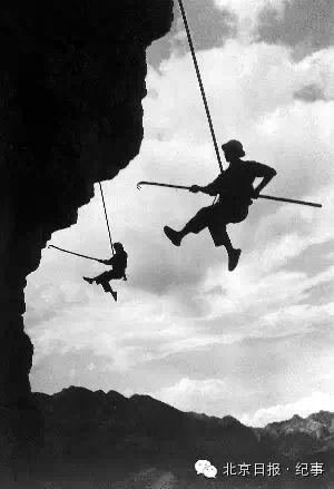 红旗渠建设过程中的凌空除险作业。很多爆破工作需要在峭壁上打炮眼,工人们也是这个悬空的姿态。