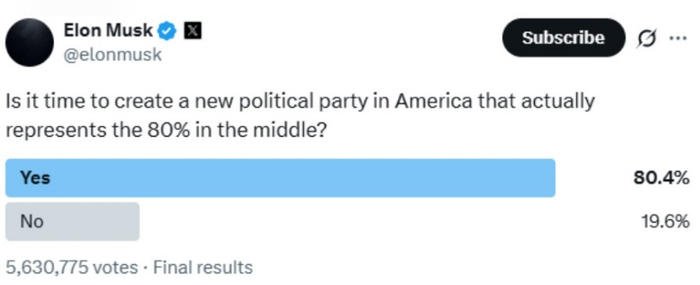 6月5日,马斯克首次表态要组建新的政党。他在社交平台上向2.2亿用户发起投票,询问是否同意“是时候在美国创建一个真正代表80%中间派的新政党了”。投票结果显示,当时超过80%的投票者都选择“是”。马斯克于6日晚间发文称:“这是命运。”随后,马斯克还表示赞同一位粉丝提出的党名建议——“美国党”(America Party)。