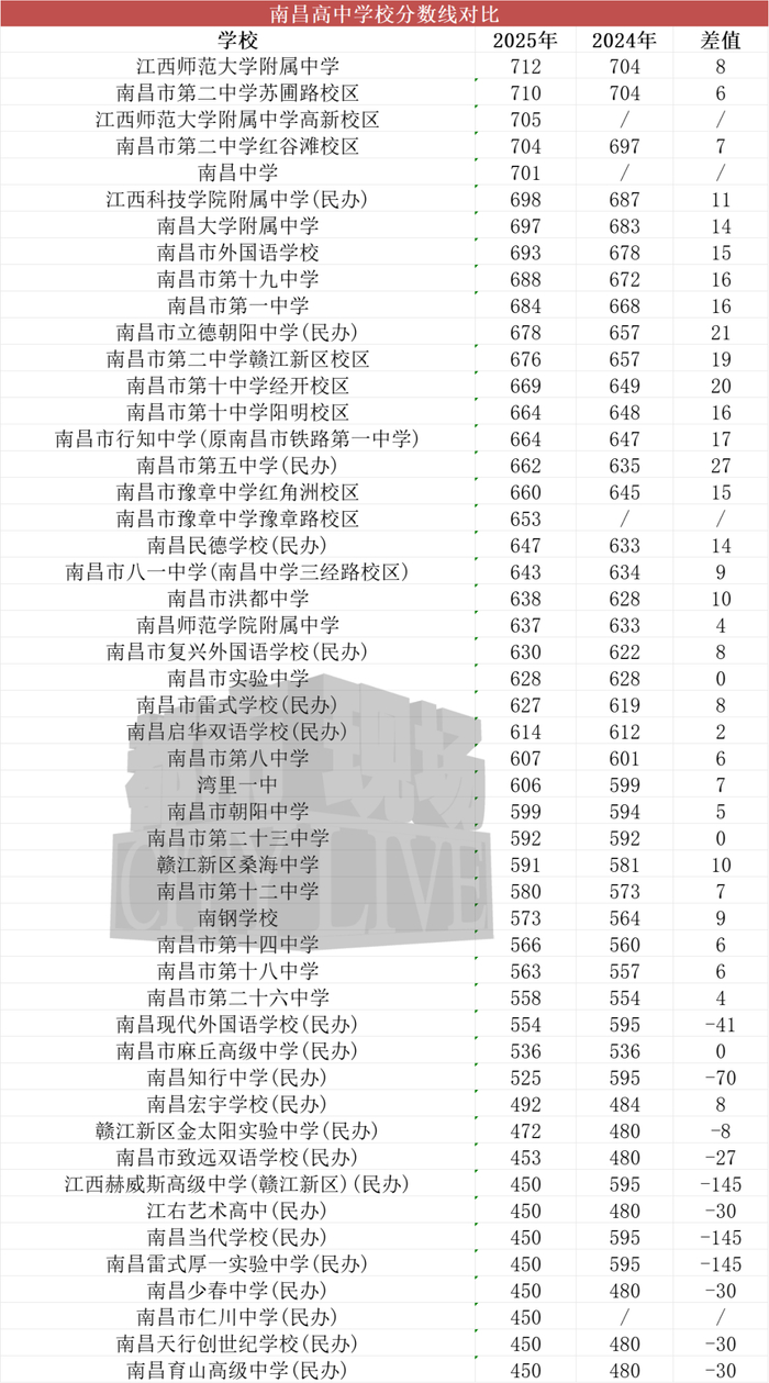 近两年南昌城区高中各校分数线对比