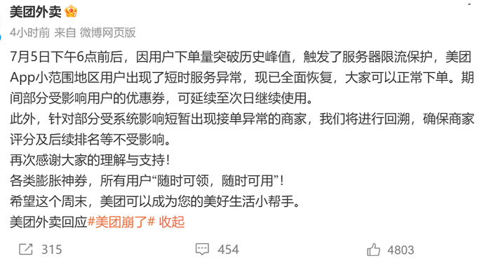 美团回应称,7月5日下午6点前后,因用户下单量突破历史峰值,触发了服务器限流保护,美团App小范围地区用户出现了短时服务异常,现已全面恢复,大家可以正常下单。在此期间部分受影响用户的优惠券,可延续至次日继续使用。此外,针对部分受系统影响短暂出现接单异常的商家,“我们将进行回溯,确保商家评分及后续排名等不受影响”。