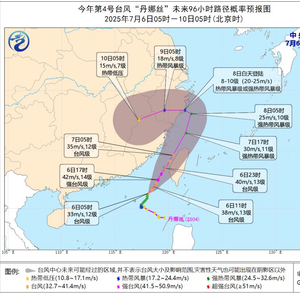 中央气象台7月6日6时继续发布台风黄色预警、暴雨蓝色预警。受台风“丹娜丝”影响,6日8时至7日8时,南海东部和南部的部分海域、台湾海峡、台湾以东洋面、巴士海峡、东海西南部、广东东部沿海、福建沿海、浙江沿海、台湾岛沿海将有6—8级大风,阵风9—10级。浙江东南部、福建东北部、台湾岛等地有大到暴雨。