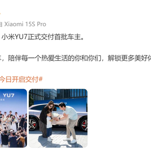 7月6日,雷军微博发文称,今天下午,小米YU7正式交付首批车主。