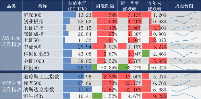 近一周市场整体上涨,主要指数多数收涨。截至周五收盘,上证指数涨1.40%,深证成指涨1.25%,创业板指涨1.50%。行业板块方面:钢铁、银行、建材指数涨幅居前;综合金融、计算机、综合指数跌幅居前。