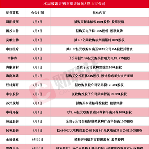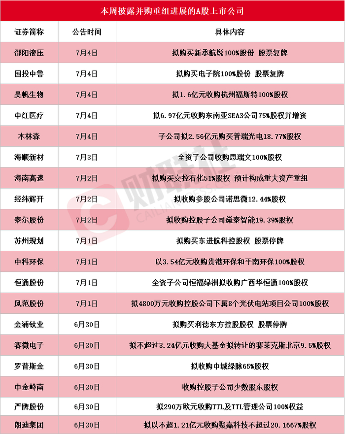 据财联社不完全统计,截至发稿,本周披露并购重组进展的A股上市公司共有19家,包括邵阳液压、国投中鲁、昊帆生物、中红医疗、木林森、海顺新材、海南高速、经纬辉开、泰尔股份、苏州规划、中科环保、恒通股份、风范股份、金浦钛业、赛微电子、罗普斯金、中金岭南、严牌股份、朗迪集团,具体情况如下图: