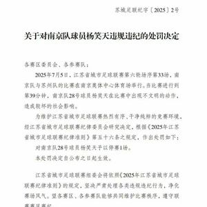 今天,江苏省城市足球联赛纪律委员会公布了对南京队28号球员杨笑天的处罚决定。