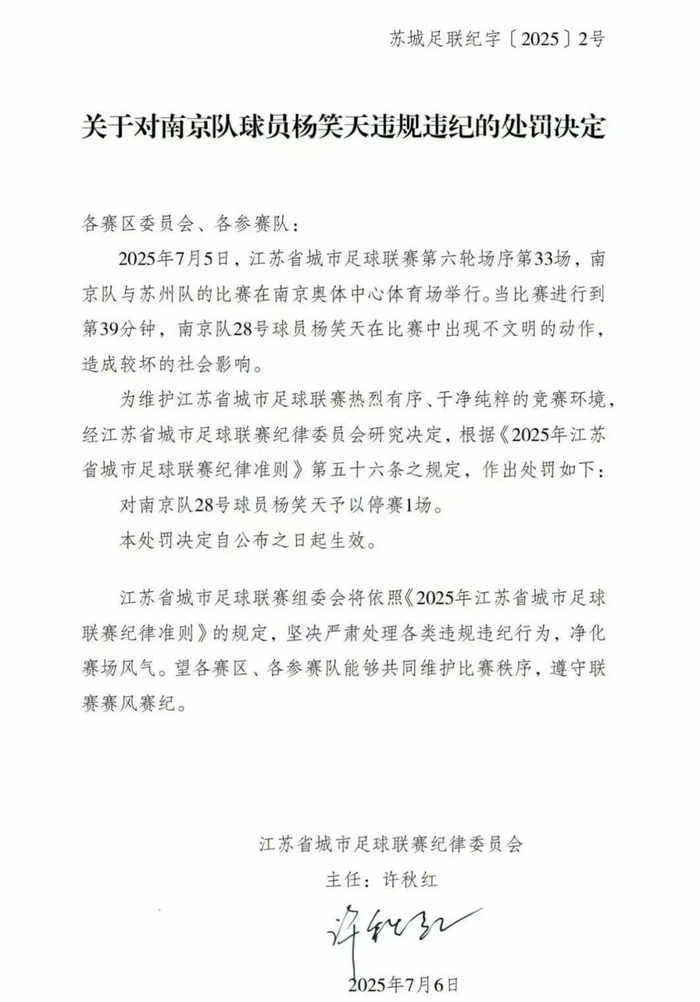 依据相关规则,江苏省城市足球联赛纪律委员会对杨笑天作出停赛1场的处罚,即日起生效。