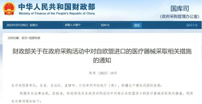 在2025年7月6日,中国财政部国库司发布了一项重要通知,即《关于在政府采购活动中对自欧盟进口的医疗器械采取相关措施的通知》(财库〔2025〕19号)。这项措施是在欧盟对中国企业设置公共采购壁垒之后出台的对等限制措施,旨在维护公平竞争环境和保护中国企业的合法权益。
