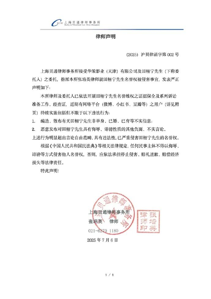 “田栩宁先生目前处于单身状态,从未结婚,亦无子女。目前关于田栩宁先生“非单身”、“已婚已育”等相关传闻皆为恶意虚构,无任何事实依据。我司恳请大家将关注点回归艺人作品与专业能力,避免对艺人的私人生活进行过度解读与干扰。即日起,我司将不再对涉及艺人个人隐私的问题予以任何形式的回应,亦不再因此类话题占用公共资源。”