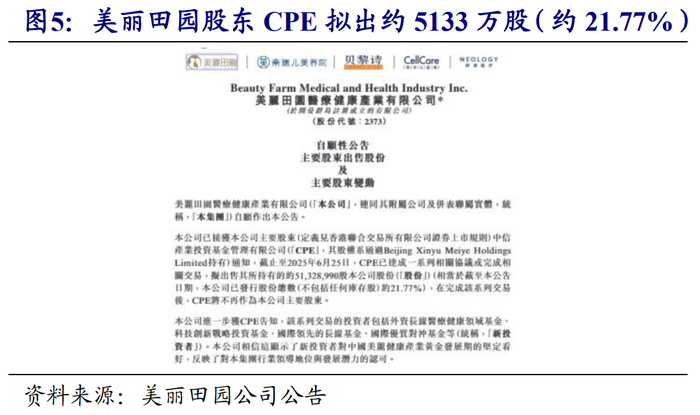 美丽田园股东CPE大幅减持退出主要股东。美丽田园医疗健康6月25日发布公告,CPE拟出售其所持有的约5133万股(约21.77%)公司股份后将不再作为公司主要股东,意味着公司股权结构将发生重大变化,新投资者的引入可能为公司带来更分散的股权结构,从长远看有助于优化公司治理结构。此外,公司5月28日增持奈瑞儿20%股权,交易完成后持股比例升至90%。公司业务聚焦于美容与保健、医疗美容、亚健康管理三大服务板块,2025H1重磅女神节大促集团权益金实现5.1亿元(同比+14.5%)、销售额5.5亿元(同比+9.7%)、客流同比+10.5%,“生美+医美+亚健康”高质量转化的优质商业模式持续验证。