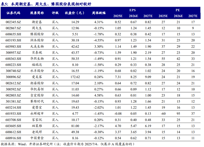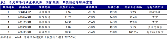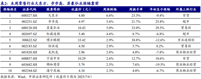 本周(6月30日-7月4日),商贸零售指数报收2152.72点,下跌0.16%,跑输上证综指(本周上涨1.40%)1.56个百分点,板块表现在31个一级行业中位居第27位。零售各细分板块中,本周钟表珠宝板块涨幅最大,2025年年初至今钟表珠宝板块领跑。个股方面,本周大东方(+6.6%)、步步高(+5.6%)、苏豪弘业(+5.0%)涨幅靠前。