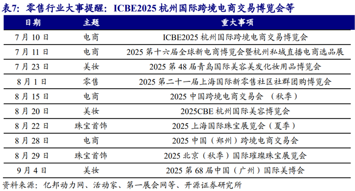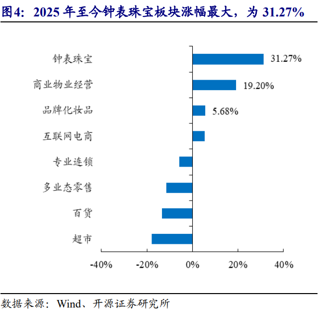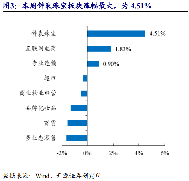 零售各细分板块中,钟表珠宝板块本周涨幅最大;2025年年初至今,钟表珠宝板块涨幅最大。在零售行业各主要细分板块(我们依据二级行业分类,选择较有代表性的超市、百货、多业态零售、专业连锁、商业物业经营、互联网电商、钟表珠宝和品牌化妆品8个细分板块)中,本周3个子板块上涨,其中钟表珠宝板块涨幅最大,周涨幅为4.51%;2025年全年来看,钟表珠宝板块年初至今累计涨幅为31.27%,在零售行业各细分板块中领跑。