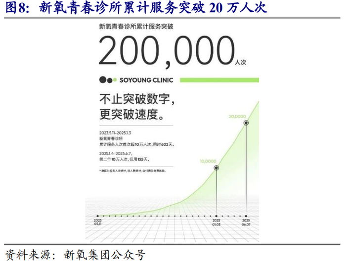 新氧青春诊所发展迅速,通过供应链布局与互联网模式实现高效运营。新氧从单纯的线上流量平台向线下连锁诊所转型,旗下轻医美连锁品牌“新氧青春诊所”发展迅速,目前已覆盖9城31家门店,2025年一季度连锁业务收入同比增长551%,截至6月7日,品牌累计服务人次突破20万。新氧通过传统互联网业务和上游布局,实现了较低的获客成本与较强的上游议价能力,在供应链端,新氧通过收购奇致激光、代理韩国爱拉丝提玻尿酸及与西宏、奥泰康药业独家合作,构建设备到耗材的全链条布局;医疗服务端,单店平均配备3-4名医生,每位医生月均完成330例治疗,远超行业平均水平,复购率超60%,通过供应链布局与互联网模式实现高效运营。