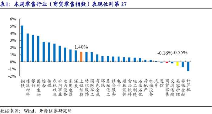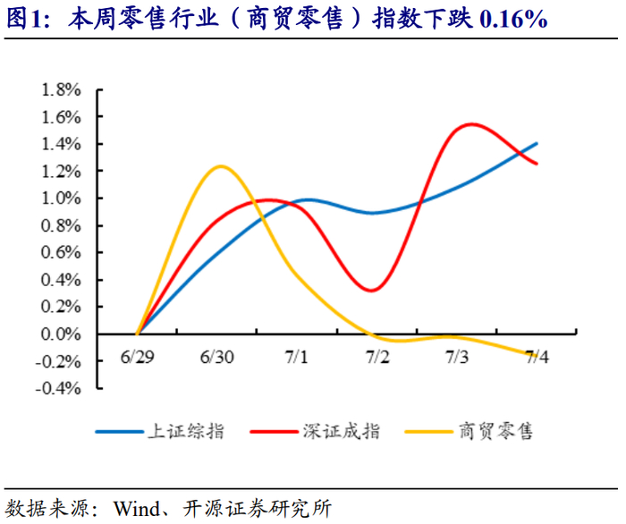 本周(6月30日-7月4日)A股上涨,零售行业指数下跌0.16%。上证综指报收3472.32点,周累计上涨1.40%;深证成指报收10508.76点,周上涨1.25%;本周全部31个一级行业中,表现排名前三位的分别为钢铁、建筑材料和银行。零售行业指数(参照商贸零售指数)本周报收2152.72点,周跌幅为0.16%,在所有一级行业中位列第27位。2025年年初至今,零售行业指数下跌3.85%,表现弱于大盘(2025年年初至今上证综指累计上涨3.60%)。