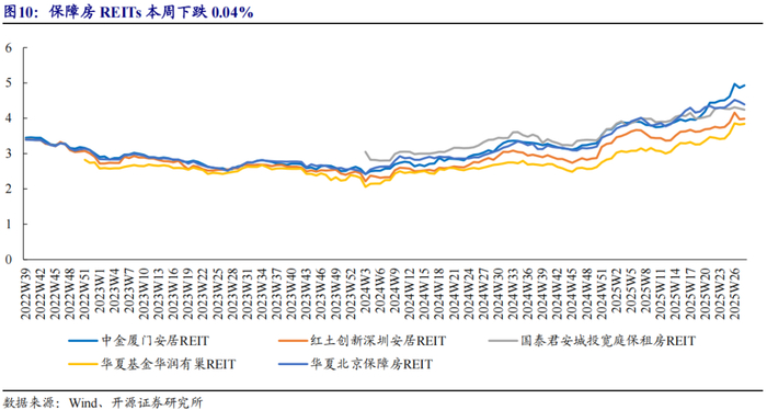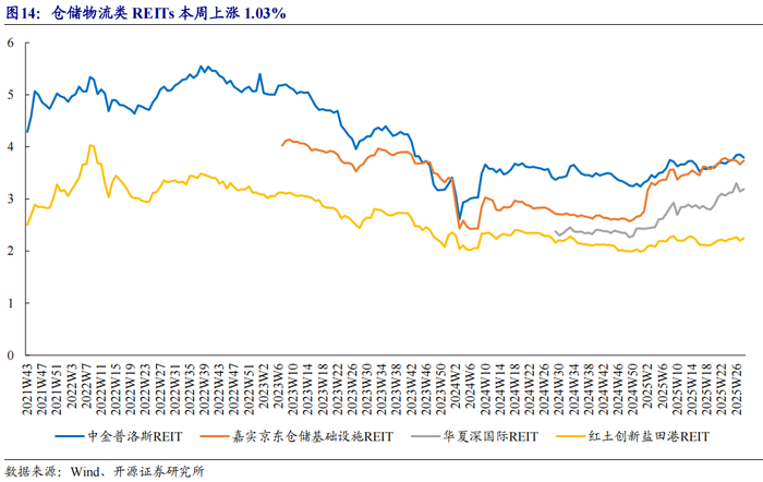 2025年第27周,中证REITs(收盘)指数为886.6,同比上涨12.84%,环比上涨0.65%;中证REITs全收益指数1116.42,同比上涨19.81%,环比上涨0.66%。本周REITs市场交易规模成交量达7.39亿份,同比增长47.21%;成交额达33.28亿元,同比增长69.88%;区间换手率3.7%,同比增长0.82%。本周保障房、环保、高速公路、产业园区、仓储物流、能源、消费类REITs一周涨跌幅分别为-0.04%、+2.34%、+0.82%、+0.58%、+1.03%、+0.62%、+0.73%;一月涨跌幅分别为+5.97%、+4.28%、+1.27%、+2.14%、+1.21%、+3.95%、+3.42%。我们认为,债券市场利率中枢下行压力下,“资产荒”逻辑有望继续演绎,REITs作为高分红、中低风险的资产,在政策力度加强以及社保金和养老金入市预期下,有望持续提升配置性价比,板块具备较好的投资机会,维持行业“看好”评级。