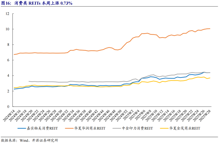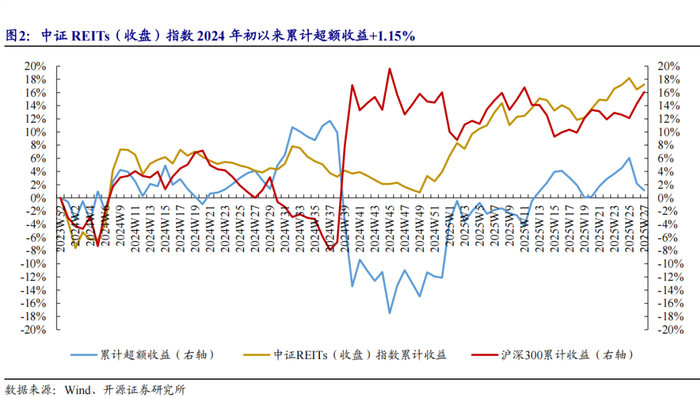 2.1、中证REITs(收盘)指数环比上涨0.65%2025年第27周,中证REITs(收盘)指数为886.6,同比上涨12.84%,环比上涨0.65%;从累计数值来看,2024年年初至今,REITs(收盘)指数累计上涨17.21%,同期沪深300指数累计上涨16.06%,累计超额收益+1.15%。