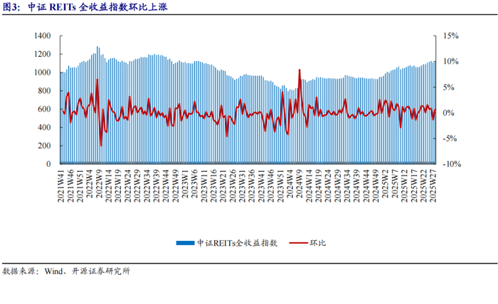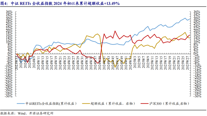 2025年第27周,中证REITs全收益指数1116.42,同比上涨19.81%,环比上涨0.66%;从累计数值看,2024年年初至今,REITs全收益指数累计上涨29.55%,同期沪深300指数累计上涨16.06%,累计超额收益+13.49%。