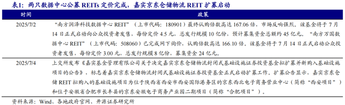 1、两只数据中心公募REITs定价完成,嘉实京东仓储物流REIT扩募启动