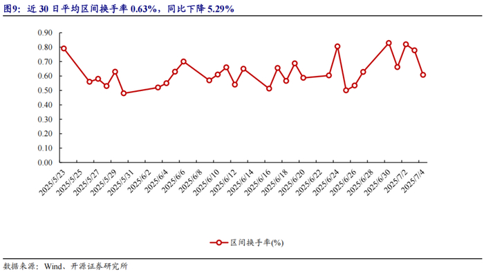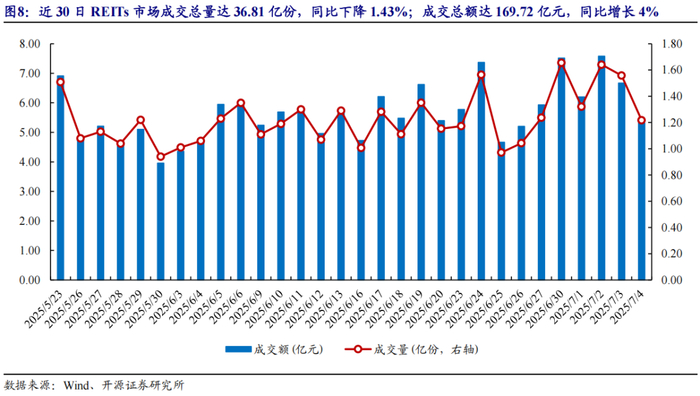 2025年第27周,REITs市场交易规模成交量达7.39亿份,同比增长47.21%;成交额达33.28亿元,同比增长69.88%;区间换手率3.7%,同比增长0.82%。