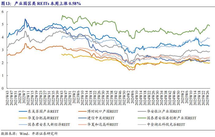 2025年第27周,保障房、环保、高速公路、产业园区、仓储物流、能源、消费类REITs一周涨跌幅分别为-0.04%、+2.34%、+0.82%、+0.58%、+1.03%、+0.62%、+0.73%;一月涨跌幅分别为+5.97%、+4.28%、+1.27%、+2.14%、+1.21%、+3.95%、+3.42%。