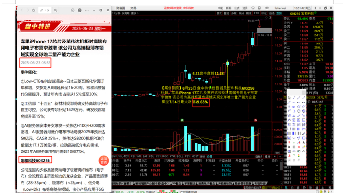 在事件利好指引下,【资讯追踪】在6月23日盘中特供,挖掘文章:标题--苹果iPhone 17芯片及英伟达机柜对高端专用电子布需求激增 该公司为高端极薄布领域实现全球唯二量产能力企业(宏和科技)10个交易日涨幅39%。