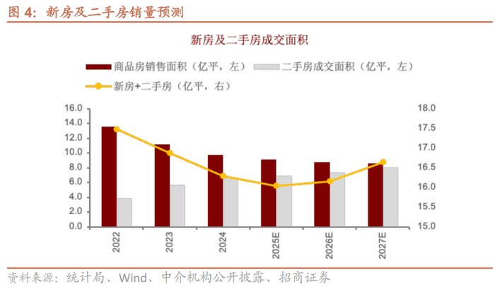 二手房成交量方面,预计25年二手房销量同比微增,26年及27年二手房销量正同比持续扩大。合计总需求层面,新房及二手房总需求有望25年筑底,26年开始逐步回升。