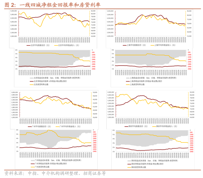 若进一步降息及租金回报率提高共同带动净租金收益率与房贷利率之差收窄(如50-70 BP),新房及二手房的合计总需求有望筑底。我们过去也提到,高能级城市由于公共资源的稀缺性,或可在净租金收益率与房贷利率之间保持一定差距的情况下实现总购房需求企稳。在当前企业端“信用底”逐步确立,居民端“信用底”较牢固的情况下,判断进一步降息及租金回报率提高共同带动净租金收益率与房贷利率之差收窄(如50-70 BP)或有助于带动新房及二手房的合计总需求企稳。