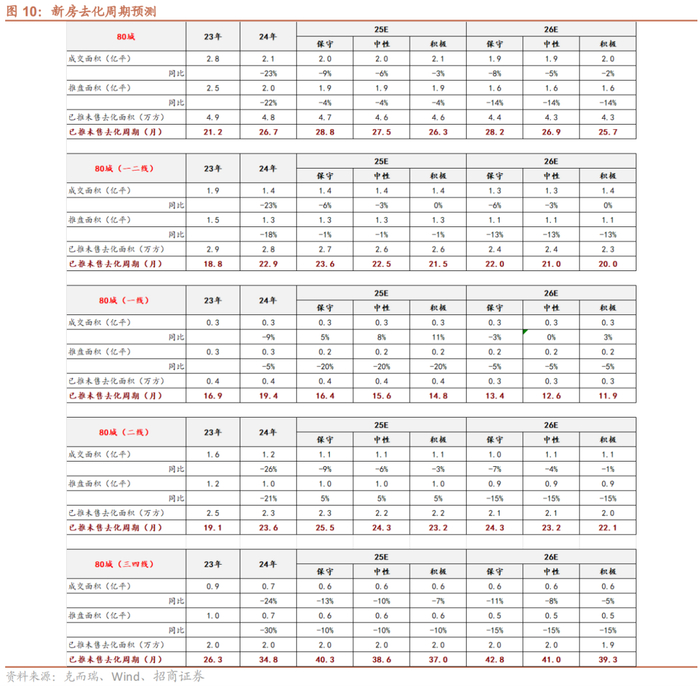 新房价格方面,考虑到(1)新房销量负增速收窄进程偏缓以及(2)24年“9.24”政策调整后土地市场热度有所回升,当前陆续形成推盘阶段性增加,判断25年新房供需关系改善节奏或慢于预期,预计25年商品房销售均价同比-1%;26年考虑到(1)供给缩量及品质提升有望推动重点城市新房去化周期降至18个月左右以及(2)当前核心城市核心地段或已体现新房价格企稳特征,商品房销售均价有望企稳。