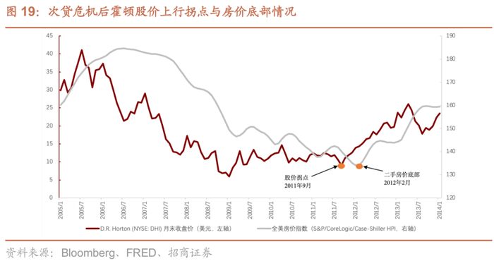 美国二手房价于2012年初才筑底回升,股票价格的上行拐点领先房价底部约半年,也就是说,当二手房价见底时间表变得清晰,资本市场会提前交易房价见底的预期。